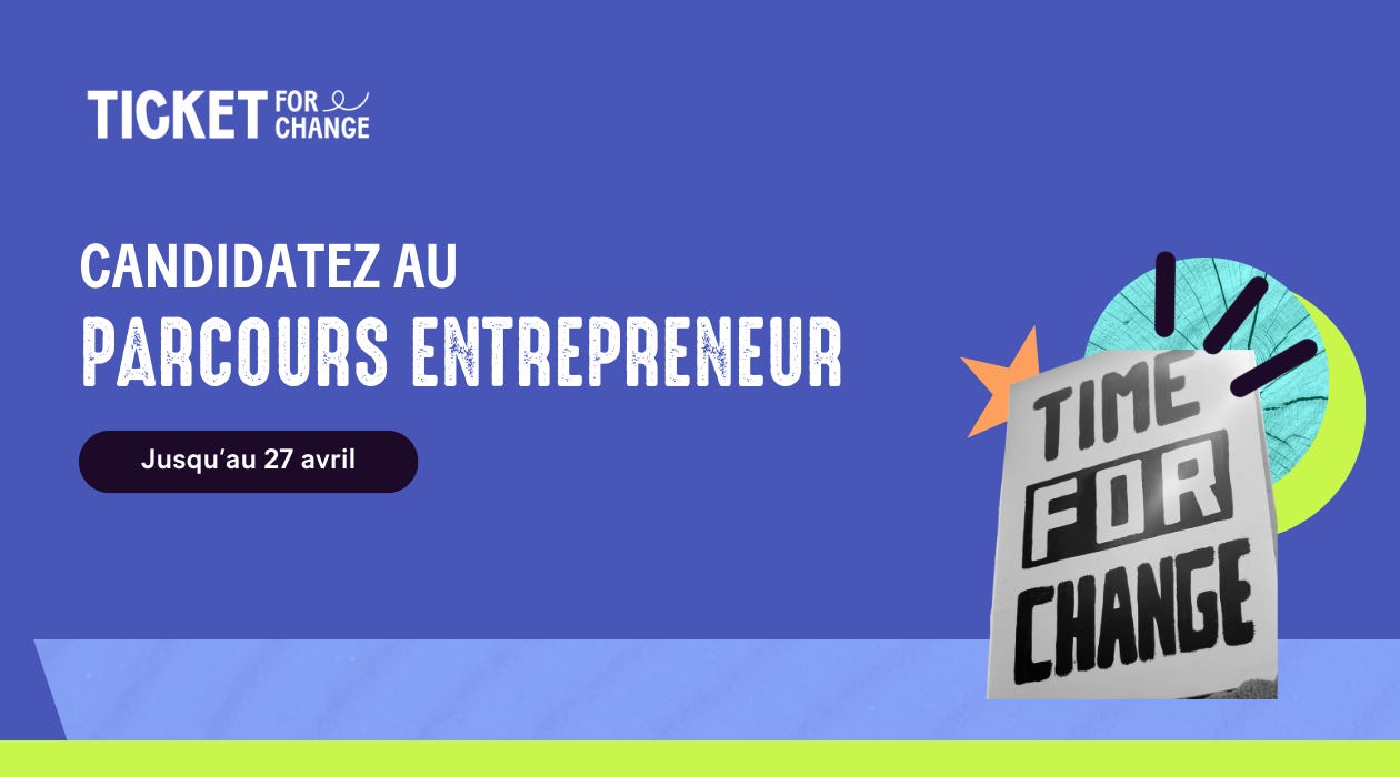 Les candidatures pour la 12e édition du Parcours Entrepreneur de Ticket for Change viennent d’ouvrir : 6 mois pour lancer votre projet à impact. De l’idée à l’action. De l’intuition à la concrétisation.